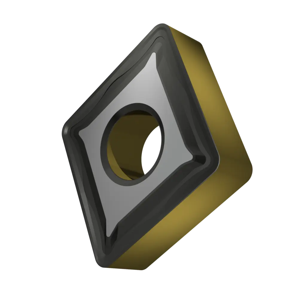 Двусторонняя негативная токарная пластина, ромбовидная 80° с диаметром вписанной окружности 19,05 мм, толщиной 6,35 мм, радиусом при вершине 1,6 мм, точностью индексации в соответствии с классом допуска ISO-M, стружколомом R со скругленными режущими кромками, из сплава T9415, функционально-градуированного твердого сплава WC-Co с покрытием MT-CVD в диапазоне ISO P05 -P30, для средней и тяжелой обработки сталей.