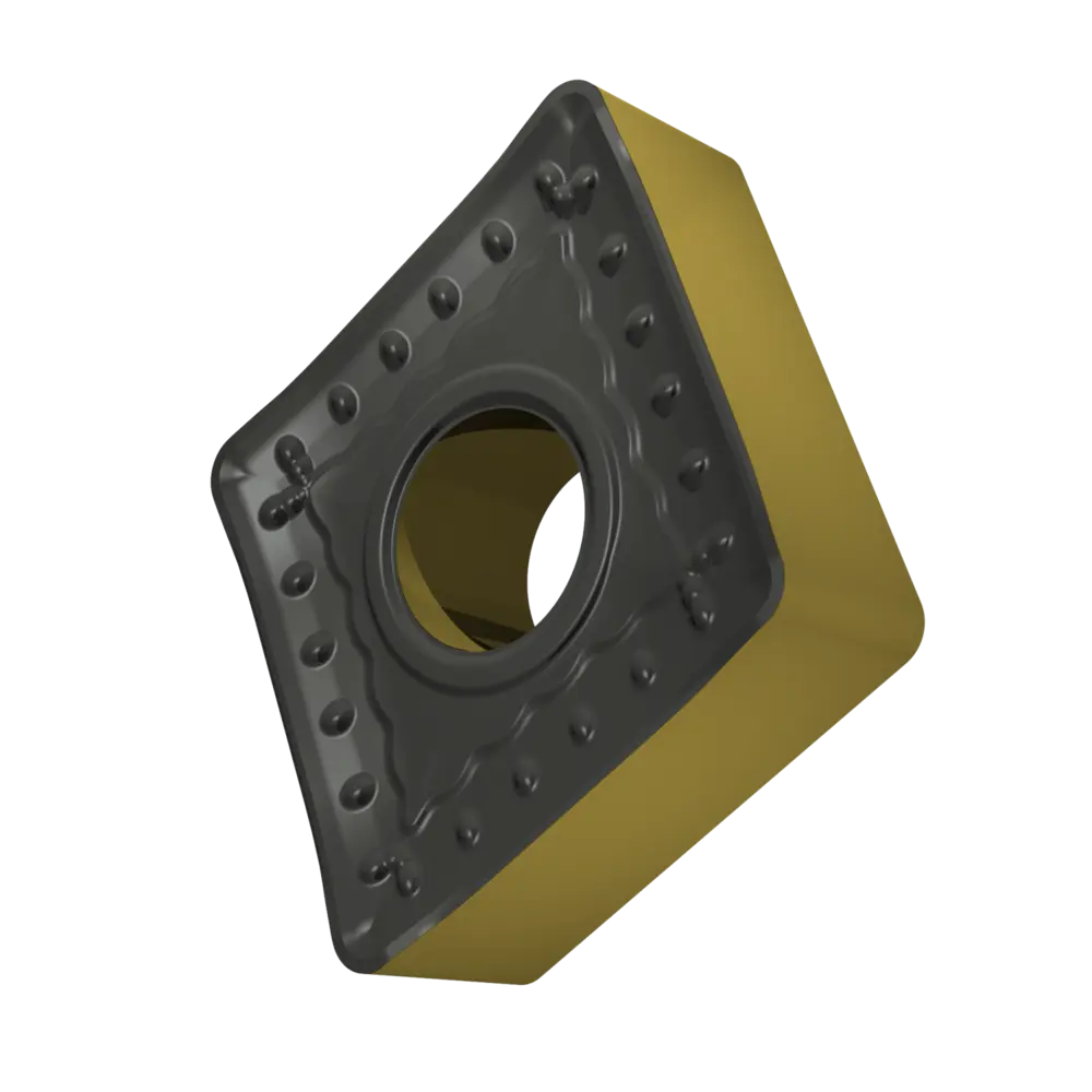 Двусторонняя негативная токарная пластина, ромбовидная 80° с диаметром вписанной окружности 15,575 мм, толщиной 6,35 мм, радиусом при вершине 1,2 мм, точностью индексации в соответствии с классом допуска ISO-M, стружколомом OR со скругленными режущими кромками, из сплава T9415, функционально классифицированного твердого сплава WC-Co с покрытием MT-CVD в диапазоне ISO P05 -P30, для средней и сверхтяжелой обработки сталей.