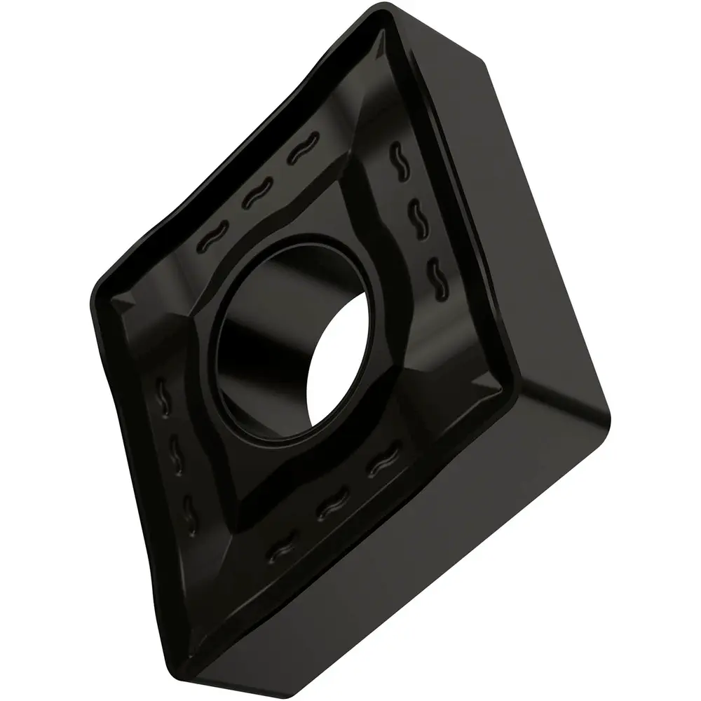 Двусторонняя негативная токарная пластина, ромбовидная 80° с диаметром вписанной окружности 19,05 мм, толщиной 6,35 мм, радиусом при вершине 2,4 мм, точностью индексации в соответствии с классом допуска ISO-M, стружколомом NR2 со скругленными режущими кромками, из сплава T9325, функционально классифицированного твердого сплава WC-Co с покрытием MT-CVD в диапазонах ISO P15 -P35 и M10 -M30, для средней и сверхтяжелой обработки сталей и нержавеющих сталей.