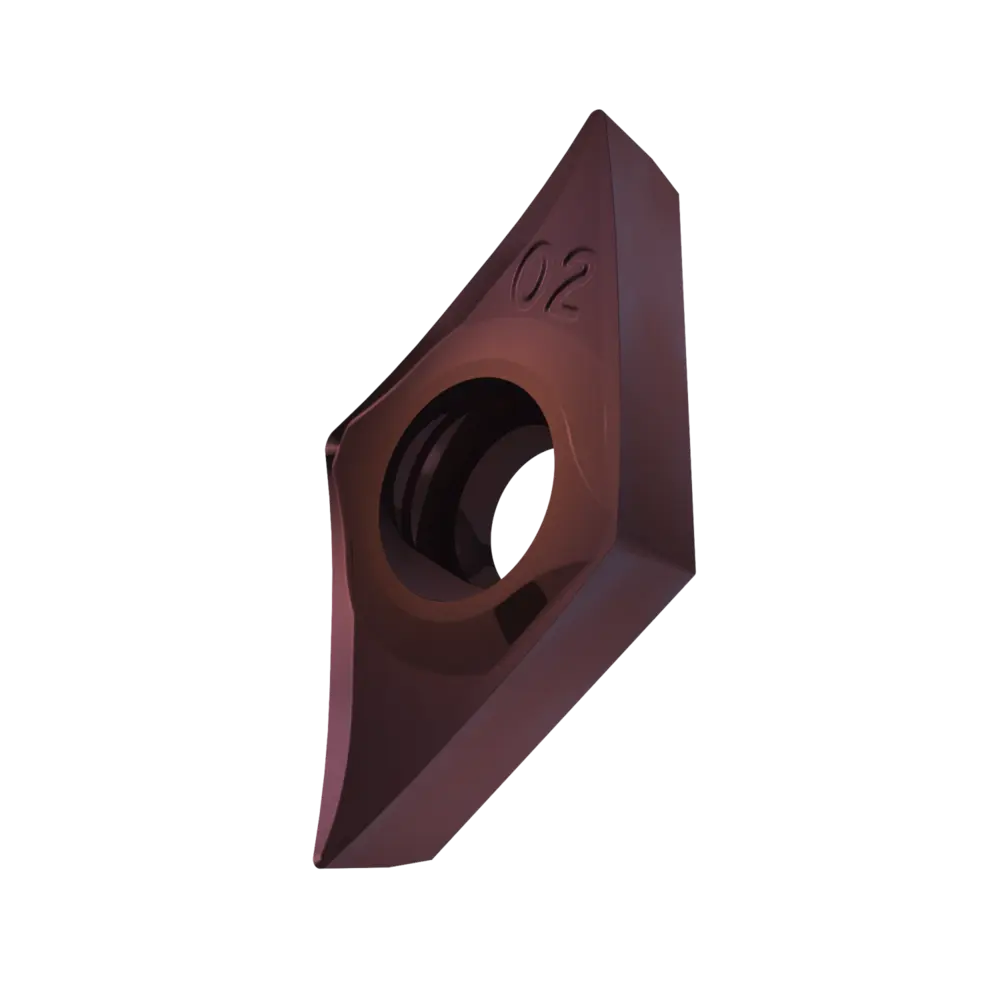 Односторонняя позитивная токарная пластина, ромб 55° с зазором 7°, диаметр вписанной окружности 6,35 мм, толщина 2,38 мм, радиус при вершине 0,2 мм, точность индексации в соответствии с классом допуска ISO-G, стружколом SF3 со скругленными режущими кромками, из сплава T8415.