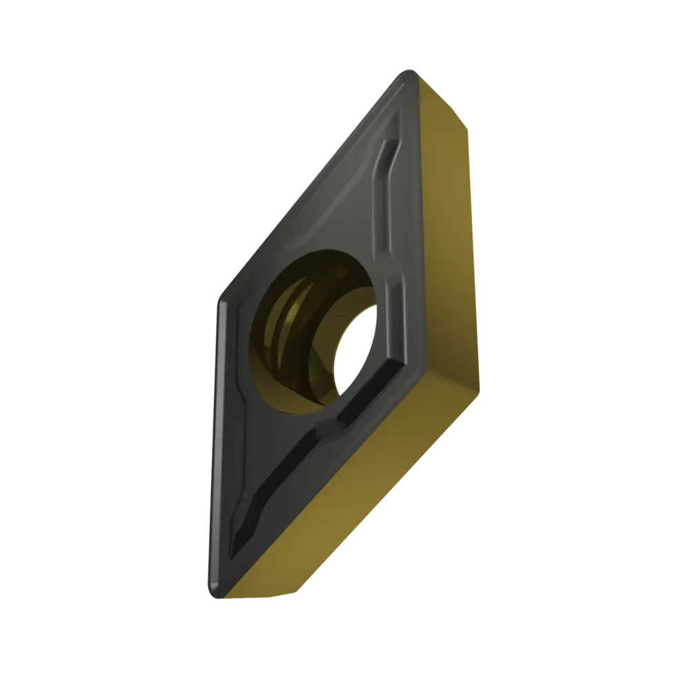 Односторонняя позитивная токарная пластина, ромбовидная 55° с зазором 7°, диаметр вписанной окружности 6,35 мм, толщина 2,38 мм, радиус вершины 0,4 мм, точность индексации в соответствии с классом допуска ISO-M, стружколом FM2 со скругленными режущими кромками, из сплава T9415, функционально-градуированного твердого сплава WC-Co с покрытием MT-CVD в диапазоне ISO P05 -P30, для чистовой и получистовой обработки сталей.