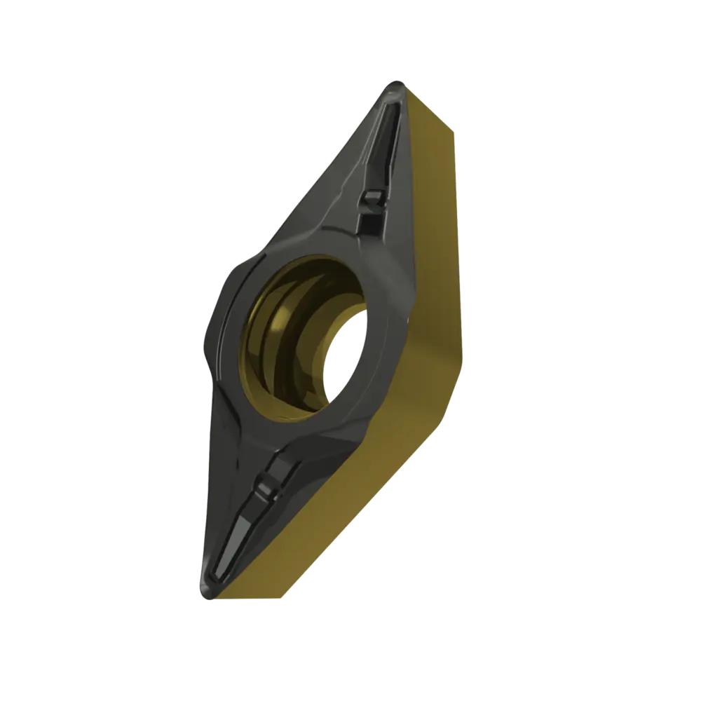 Односторонняя позитивная токарная пластина, ромбовидная 55° с зазором 7°, диаметр вписанной окружности 6,35 мм, толщина 2,38 мм, радиус вершины 0,4 мм, точность индексации в соответствии с классом допуска ISO-M, стружколом UR со скругленными режущими кромками, из сплава T9415, функционально-градуированного твердого сплава WC-Co с покрытием MT-CVD в диапазоне ISO P05 -P30, для чистовой и тяжелой обработки сталей.