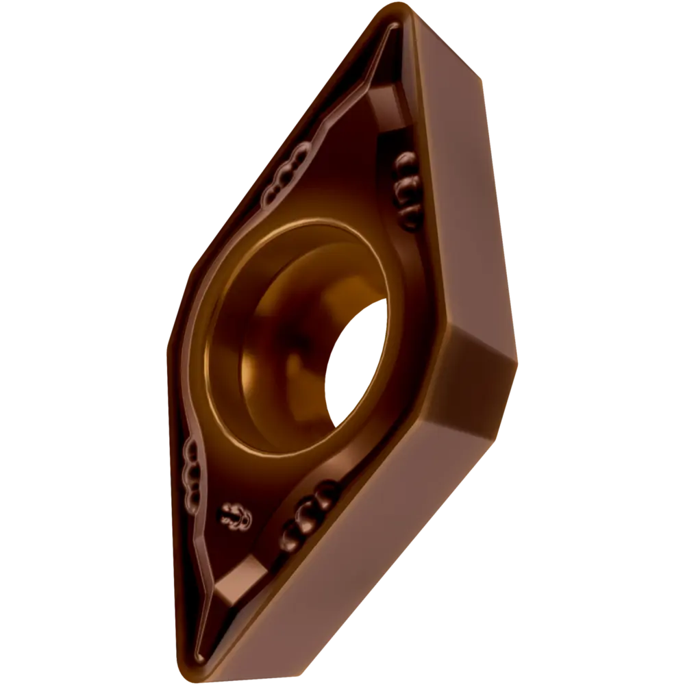 Односторонняя позитивная токарная пластина, ромбовидная 55° с зазором 7°, диаметр вписанной окружности 9,525 мм, толщина 3,97 мм, радиус вершины 0,2 мм, точность индексации в соответствии с классом допуска ISO-M, стружколом FM со скругленными режущими кромками, из сплава T8430, мелкозернистого твердого сплава WC-Co с покрытием PVD в диапазонах ISO P20 -P40 и M20 -M35, для чистовой и средней обработки сталей и нержавеющих сталей.