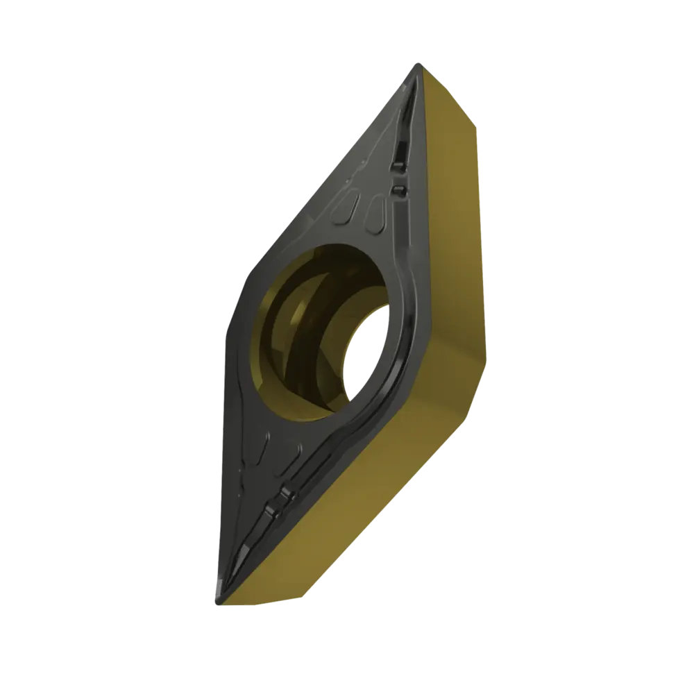 Односторонняя позитивная токарная пластина, ромбовидная 55° с зазором 7°, диаметр вписанной окружности 9,525 мм, толщина 3,97 мм, радиус вершины 0,2 мм, точность индексации в соответствии с классом допуска ISO-M, стружколом UR со скругленными режущими кромками, из сплава T9415, функционально-градуированного твердого сплава WC-Co с покрытием MT-CVD в диапазоне ISO P05 -P30, для чистовой и тяжелой обработки сталей.