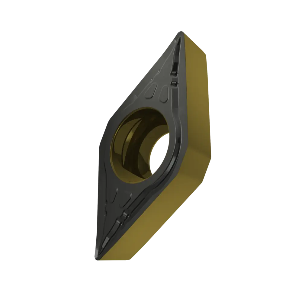Односторонняя позитивная токарная пластина, ромбовидная 55° с зазором 7°, диаметр вписанной окружности 9,525 мм, толщина 3,97 мм, радиус вершины 0,4 мм, точность индексации в соответствии с классом допуска ISO-M, стружколом UR со скругленными режущими кромками, из сплава T9415, функционально-градуированного твердого сплава WC-Co с покрытием MT-CVD в диапазоне ISO P05 -P30, для чистовой и тяжелой обработки сталей.