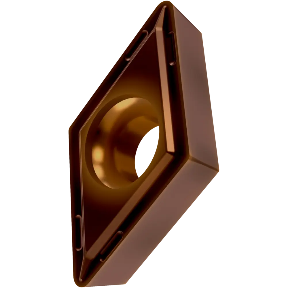 Односторонняя позитивная токарная пластина, ромбовидная 55° с зазором 7°, диаметр вписанной окружности 9,525 мм, толщина 3,97 мм, радиус вершины 0,8 мм, точность индексации в соответствии с классом допуска ISO-M, стружколом FF2 со скругленными режущими кромками, из сплава T8430, мелкозернистого твердого сплава WC-Co с покрытием PVD в диапазоне ISO P20 -P40, для чистовой и средней обработки сталей.
