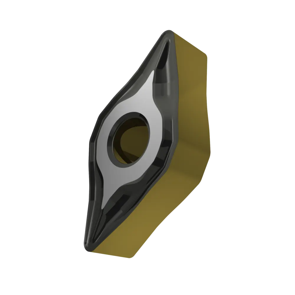 Двусторонняя негативная токарная пластина, ромбовидная 55° с диаметром вписанной окружности 9,525 мм, толщиной 4,76 мм, радиусом при вершине 0,8 мм, точностью индексации в соответствии с классом допуска ISO-M, стружколомом NF со скругленными режущими кромками, из сплава T9415, функционально-градуированного твердого сплава WC-Co с покрытием MT-CVD в диапазоне ISO P05 -P30, для чистовой и получистовой обработки сталей.
