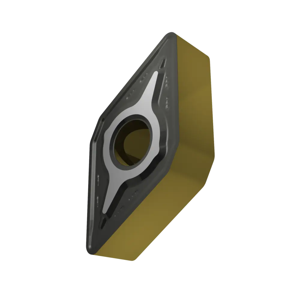 Двусторонняя негативная токарная пластина, ромбовидная 55° с диаметром вписанной окружности 9,525 мм, толщиной 4,76 мм, радиусом при вершине 0,8 мм, точностью индексации в соответствии с классом допуска ISO-M, стружколомом RM со скругленными режущими кромками, из сплава T9415, функционально классифицированного твердого сплава WC-Co с покрытием MT-CVD в диапазоне ISO P05 -P30, для средней и тяжелой обработки сталей.