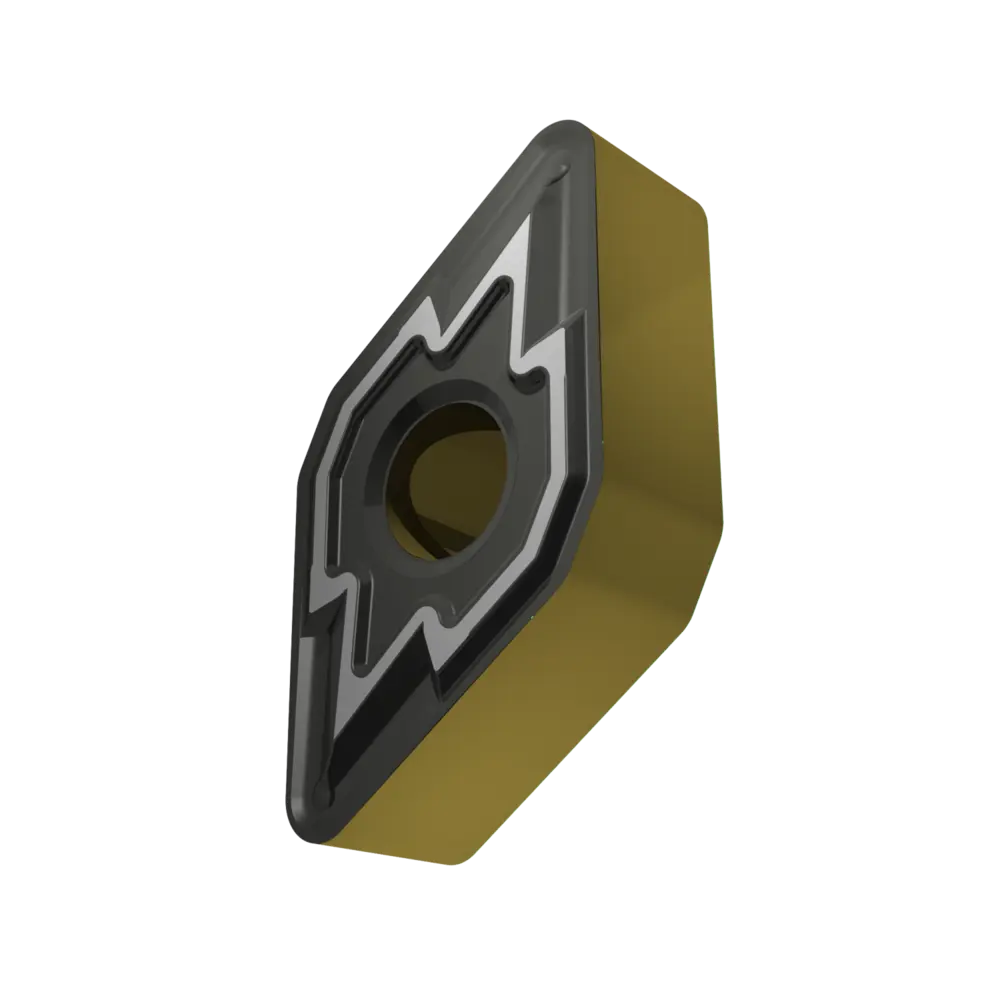 Двусторонняя негативная токарная пластина, ромбовидная 55° с диаметром вписанной окружности 9,525 мм, толщиной 4,76 мм, радиусом при вершине 1,2 мм, точностью индексации в соответствии с классом допуска ISO-M, стружколомом M со скругленными режущими кромками, из сплава T9415, функционально-градуированного твердого сплава WC-Co с покрытием MT-CVD в диапазоне ISO P05 -P30, для чистовой и тяжелой обработки сталей.