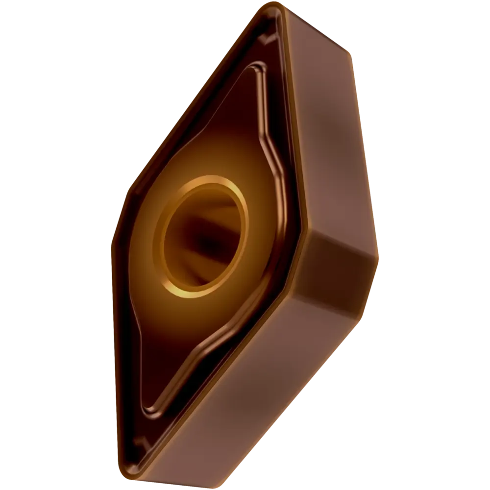 Двусторонняя негативная токарная пластина, ромбовидная 55° с диаметром вписанной окружности 12,7 мм, толщиной 4,76 мм, радиусом при вершине 0,8 мм, точностью индексации в соответствии с классом допуска ISO-M, стружколомом NM со скругленными режущими кромками, из сплава T8430, мелкозернистого твердого сплава WC-Co с покрытием PVD в диапазонах ISO P20 -P40 и M20 -M35, для чистовой и тяжелой обработки сталей и нержавеющих сталей.