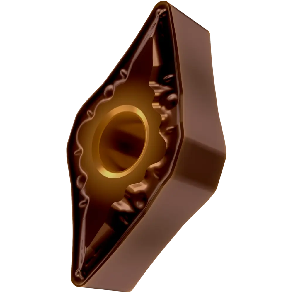 Двусторонняя негативная токарная пластина, ромбовидная 55° с диаметром вписанной окружности 12,7 мм, толщиной 6,35 мм, радиусом при вершине 0,4 мм, точностью индексации в соответствии с классом допуска ISO M, стружколомом FM со скругленными режущими кромками, из сплава T8430, мелкозернистого твердого сплава WC-Co с покрытием PVD в диапазоне ISO P20 -P40, для чистовой и средней обработки сталей.