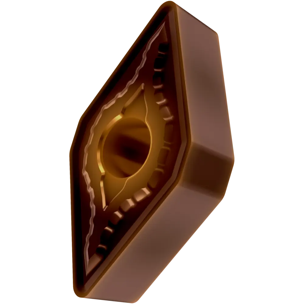 Двусторонняя негативная токарная пластина, ромбовидная 55° с диаметром вписанной окружности 12,7 мм, толщиной 6,35 мм, радиусом при вершине 1,2 мм, точностью индексации в соответствии с классом допуска ISO-M, стружколомом SM со скругленными режущими кромками, из сплава T8430, мелкозернистого твердого сплава WC-Co с покрытием PVD в диапазонах ISO P20 -P40 и M20 -M35, для чистовой и тяжелой обработки сталей и нержавеющих сталей.