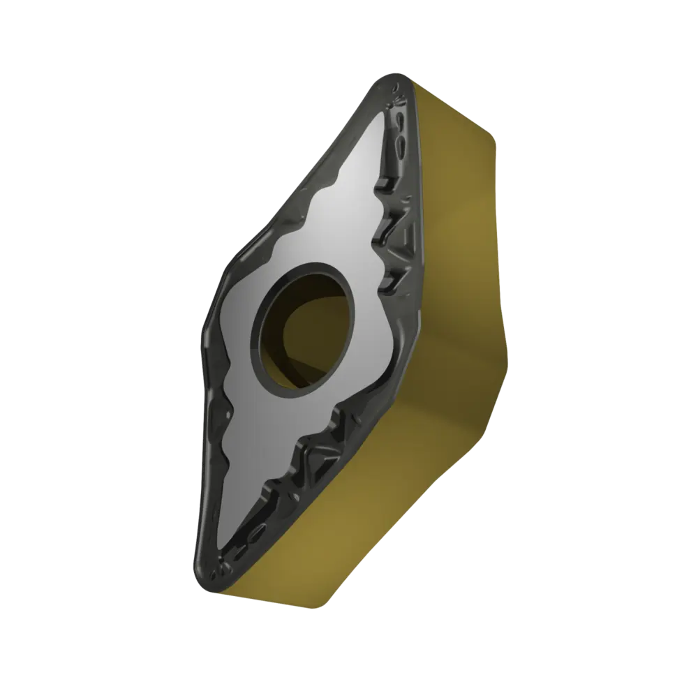 Двусторонняя негативная токарная пластина, ромбовидная 55° с диаметром вписанной окружности 12,7 мм, толщиной 6,35 мм, радиусом при вершине 1,6 мм, точностью индексации в соответствии с классом допуска ISO M, стружколомом FM со скругленными режущими кромками, из сплава T9415, функционально-градуированного твердого сплава WC-Co с покрытием MT-CVD в диапазоне ISO P05 -P30, для чистовой и получистовой обработки сталей.
