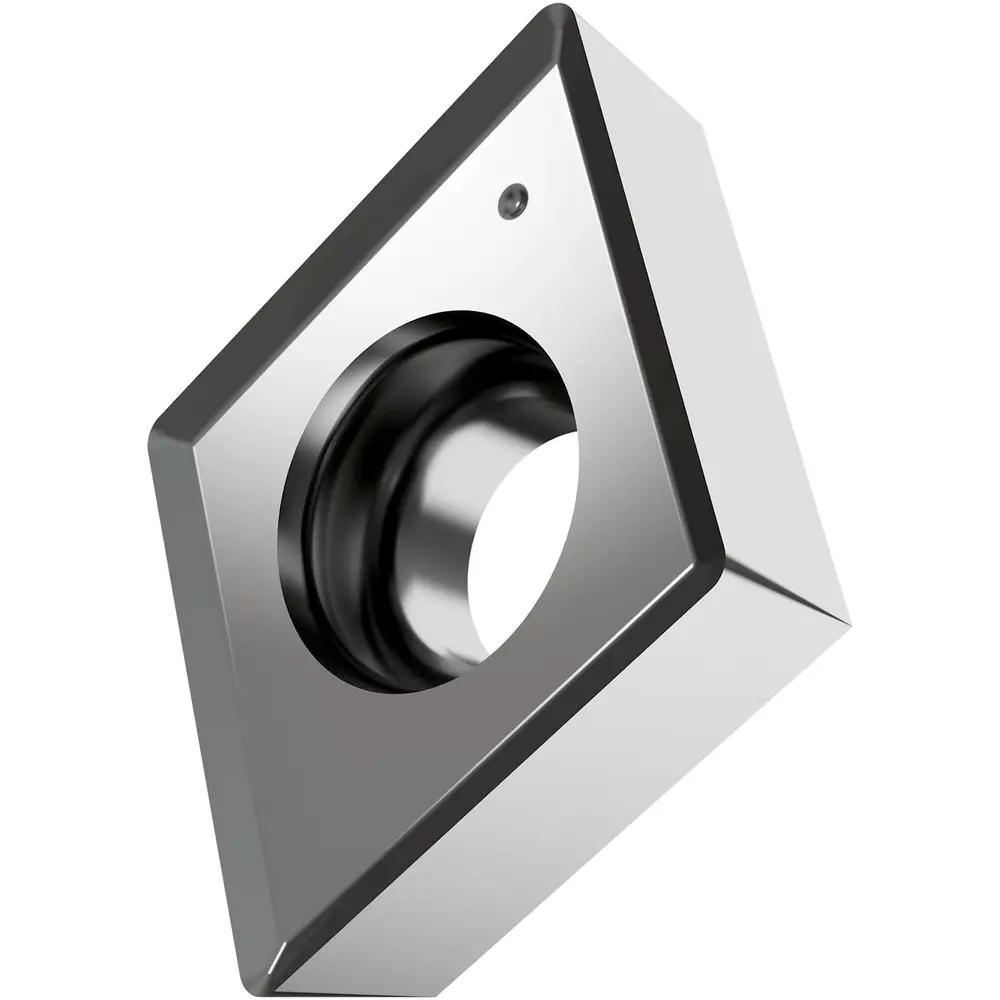 Односторонняя позитивная токарная пластина, ромбовидная 75° с зазором 7°, диаметр вписанной окружности 6,35 мм, толщина 2,38 мм, радиус вершины 0,2 мм, точность индексации в соответствии с классом допуска ISO-G, стружколом SF2 со скругленными режущими кромками, из сплава H07, непокрытый карбид WC-Co в диапазоне ISO S01 -S20, для чистовой и получистовой обработки суперсплавов
