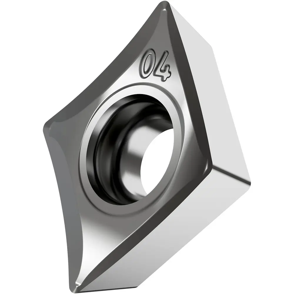 Односторонняя позитивная токарная пластина, ромбовидная 75° с зазором 7°, диаметр вписанной окружности 7,94 мм, толщина 3,18 мм, радиус вершины 0,4 мм, точность индексации в соответствии с классом допуска ISO-G, стружколом SF3 со скругленными режущими кромками, из сплава H07, непокрытый карбид WC-Co в диапазонах ISO N10 -N30 и S01 -S20, для чистовой и средней обработки цветных металлов и суперсплавов.