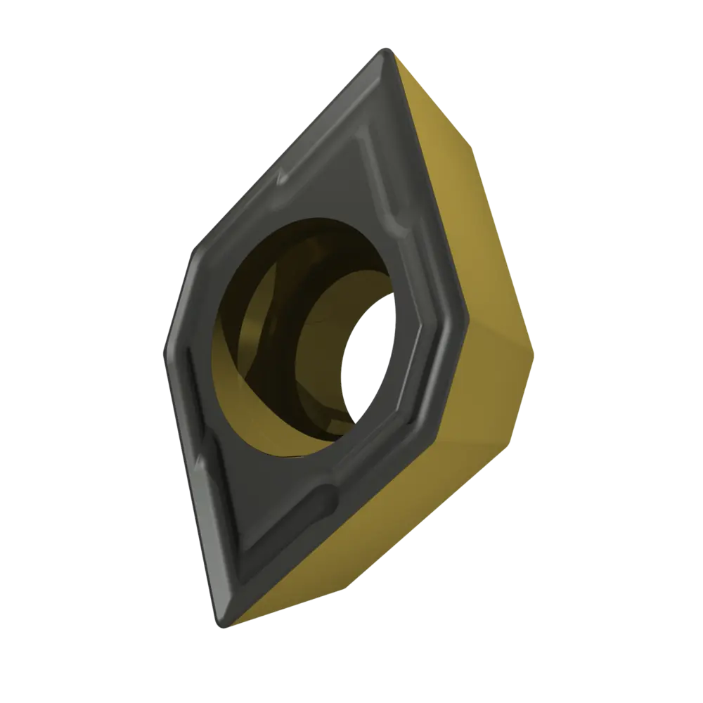 Односторонняя позитивная токарная пластина, ромбовидная 75° с зазором 11°, диаметр вписанной окружности 5,56 мм, толщина 2,38 мм, радиус вершины 0,2 мм, точность индексации в соответствии с классом допуска ISO-M, стружколом NF2 со скругленными режущими кромками, из сплава T9415, функционально-градуированного твердого сплава WC-Co с покрытием MT-CVD, для тонкой и средней обработки