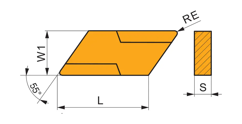Специальная негативная токарная пластина, параллелограмм 55° с длиной главной кромки 16 мм, толщиной 4,76 мм, радиусом при вершине 0,5 мм и точностью индексации в соответствии с классом допуска U по ISO, стружколомом 22, из сплава T7335, функционально-градуированного твердого сплава WC-Co с покрытием MT-CVD, для средней и тяжелой обработки левосторонним токарным резцом.