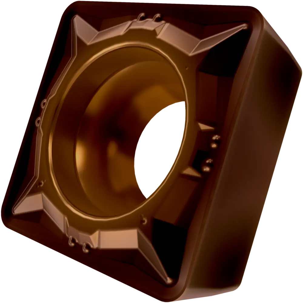 Односторонняя позитивная токарная пластина, квадратная с зазором 7°, диаметр вписанной окружности 9,525 мм, толщина 3,97 мм, радиус при вершине 0,8 мм, точность индексации в соответствии с классом допуска ISO-M, стружколом FM со скругленными режущими кромками, из сплава T8415.