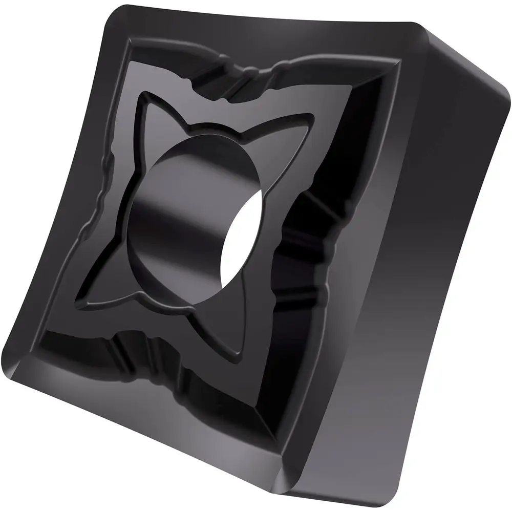 Двусторонняя негативная токарная пластина, квадратная с диаметром вписанной окружности 12,7 мм, толщиной 4,76 мм, радиусом при вершине 0,8 мм, точность индексации в соответствии с классом допуска ISO M, стружколом SF со скругленными режущими кромками, из сплава T6310, сверхмелкозернистого твердого сплава WC-Co с покрытием PVD в диапазонах ISO P01 -P15/M01 -M15/K05 -K20/S01 -S15 и H01 -H15, для чистовой и средней обработки сталей, нержавеющих сталей, чугунов, суперсплавов и закаленных материалов.