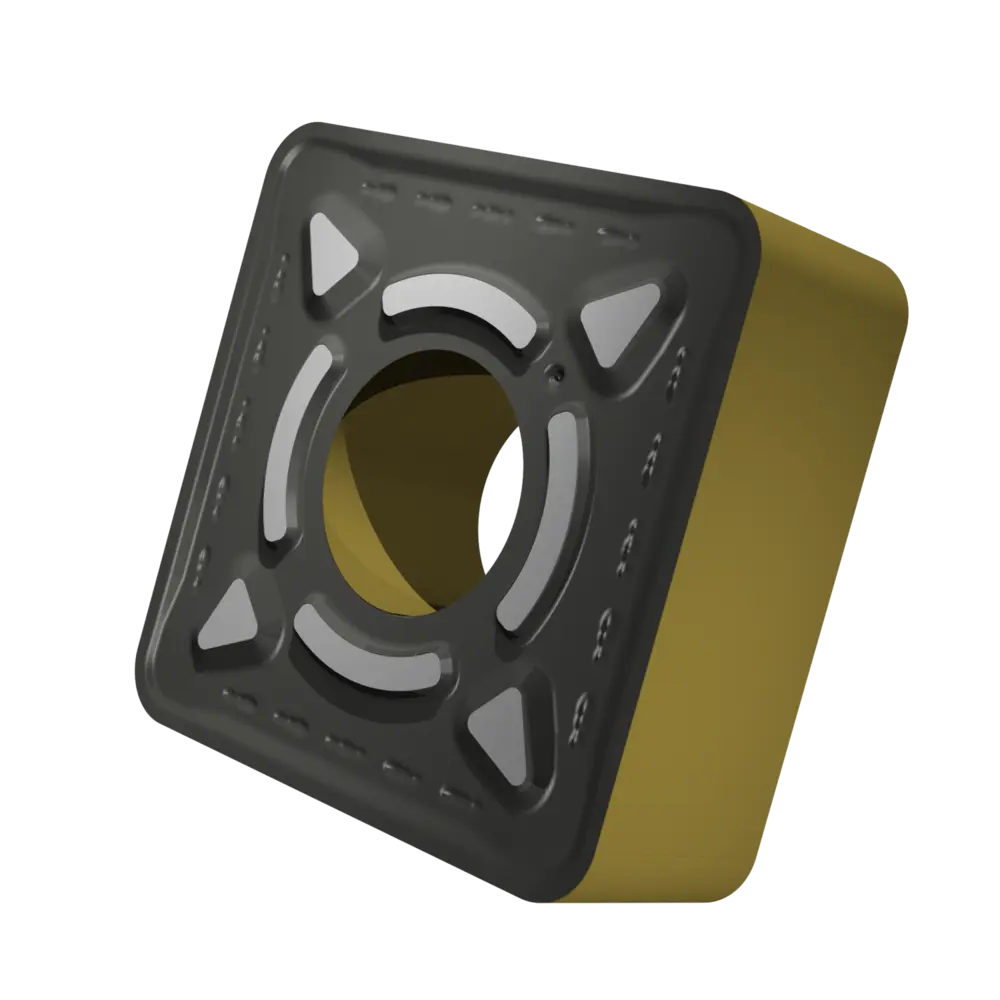 Двусторонняя негативная токарная пластина, квадратная с диаметром вписанной окружности 15,875 мм, толщиной 6,35 мм, радиусом при вершине 1,6 мм, точностью индексации в соответствии с классом допуска ISO M, стружколомом RM со скругленными режущими кромками, из сплава T9415, функционально-градуированного твердого сплава WC-Co с покрытием MT-CVD в диапазоне ISO P05 -P30, для средней и тяжелой обработки сталей.