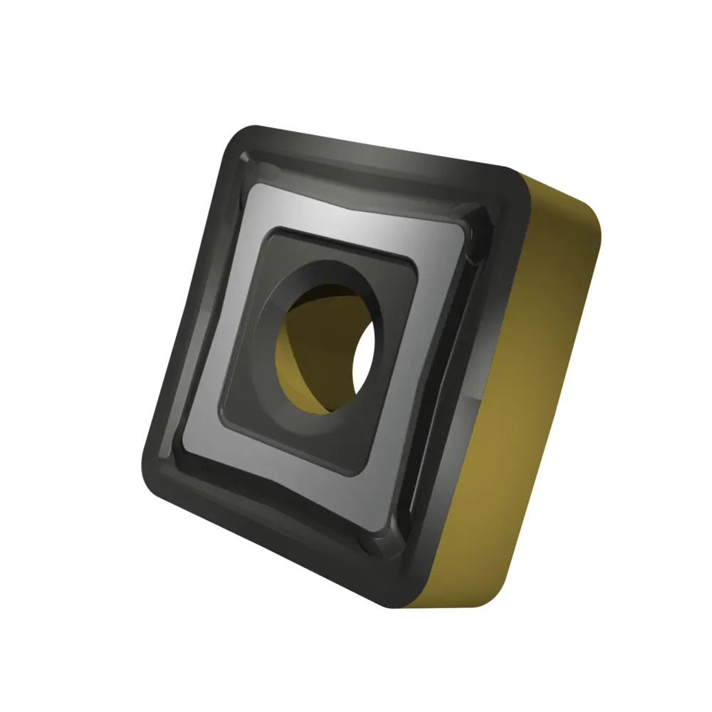 Двусторонняя негативная токарная пластина, квадратная с диаметром вписанной окружности 19,05 мм, толщиной 6,35 мм, радиусом при вершине 1,2 мм, точностью индексации в соответствии с классом допуска ISO M, стружколомом M со скругленными режущими кромками, из сплава T9415, функционально-градуированного твердого сплава WC-Co с покрытием MT-CVD в диапазоне ISO P05 -P30, для чистовой и тяжелой обработки сталей.