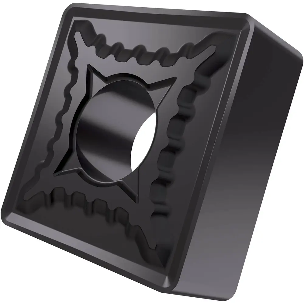Двусторонняя негативная токарная пластина, квадратная с диаметром вписанной окружности 19,05 мм, толщиной 6,35 мм, радиусом при вершине 1,2 мм, точностью индексации в соответствии с классом допуска ISO M, стружколомом SM со скругленными режущими кромками, из сплава T6310, сверхмелкозернистого твердого сплава WC-Co с покрытием PVD в диапазонах ISO P01 -P15/M01 -M15/K05 -K20 и S01 -S15, для чистовой и тяжелой обработки сталей, нержавеющих сталей, чугунов и суперсплавов.