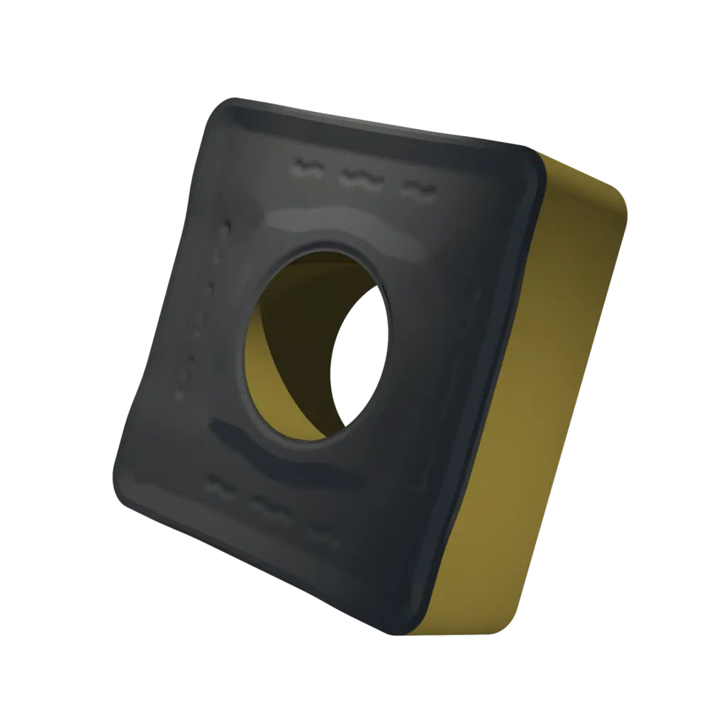 Двусторонняя негативная токарная пластина, квадратная с диаметром вписанной окружности 19,05 мм, толщиной 6,35 мм, радиусом при вершине 1,6 мм, точностью индексации в соответствии с классом допуска ISO-M, стружколомом NR2 со скругленными режущими кромками, из сплава T9415, функционально классифицированного твердого сплава WC-Co с покрытием MT-CVD в диапазоне ISO P05 -P30, для средней и сверхтяжелой обработки сталей.
