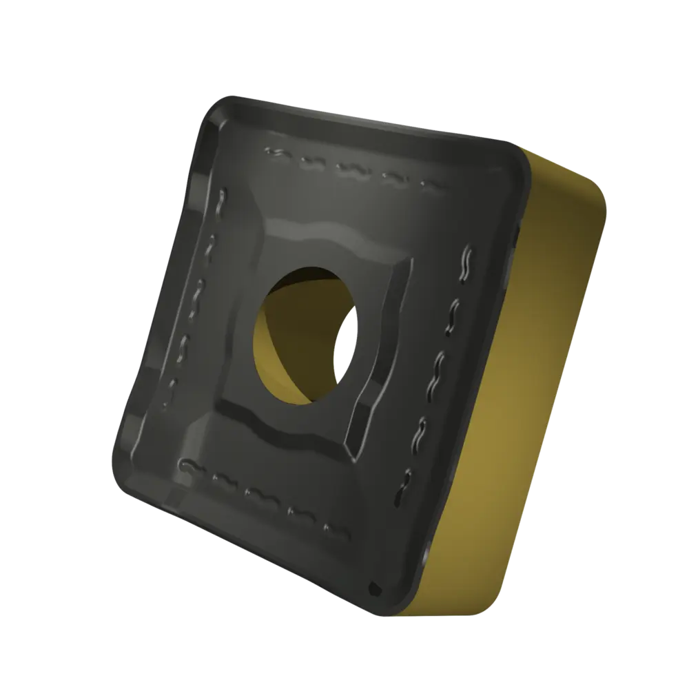 Двусторонняя негативная токарная пластина, квадратная с диаметром вписанной окружности 25,4 мм, толщиной 7,94 мм, радиусом при вершине 2,4 мм, точностью индексации в соответствии с классом допуска ISO-M, стружколомом NR2 со скругленными режущими кромками, из сплава T9415, функционально-градуированного твердого сплава WC-Co с покрытием MT-CVD в диапазоне ISO P05 -P30, для средней и сверхтяжелой обработки сталей.