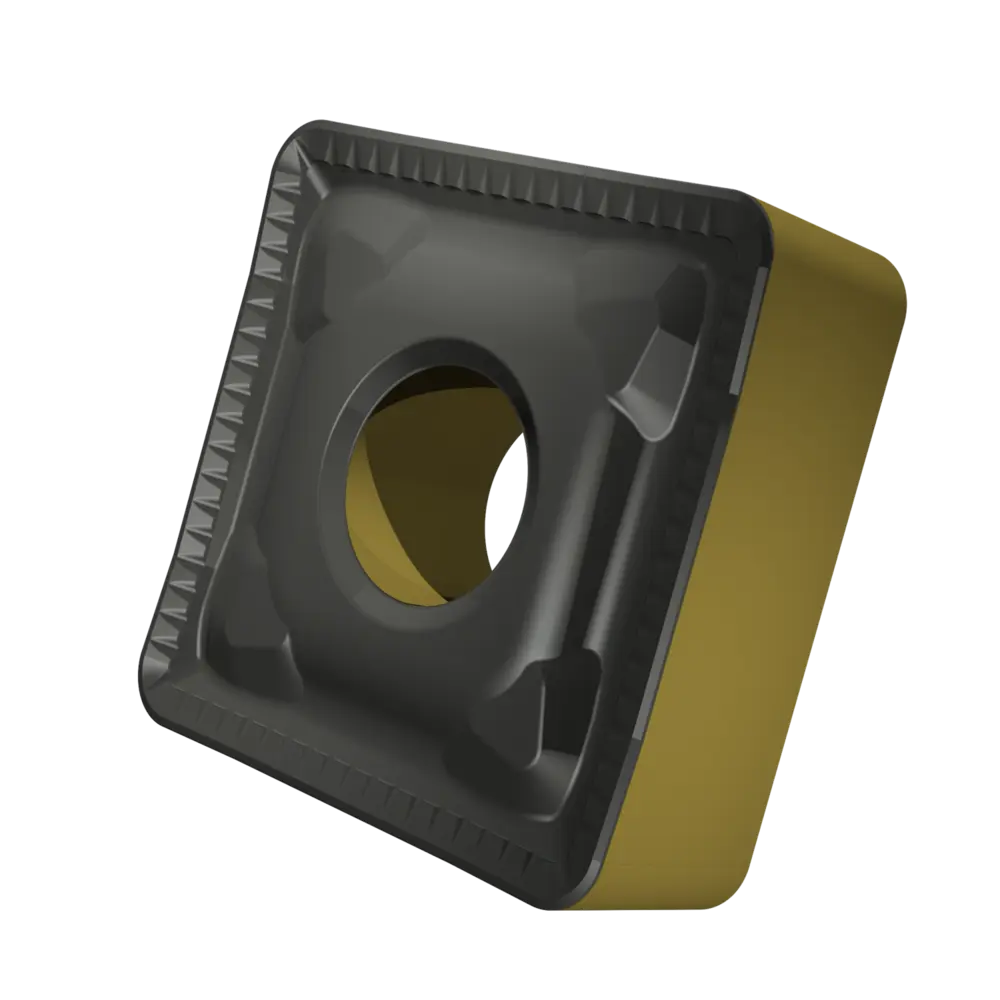 Двусторонняя негативная токарная пластина, квадратная с диаметром вписанной окружности 25,4 мм, толщиной 9,52 мм, радиусом при вершине 2,4 мм, точностью индексации в соответствии с классом допуска ISO-M, стружколомом HR со скругленными режущими кромками, из сплава T9415, функционально классифицированного твердого сплава WC-Co с покрытием MT-CVD в диапазоне ISO P05 -P30, для тяжелой и сверхтяжелой обработки сталей.