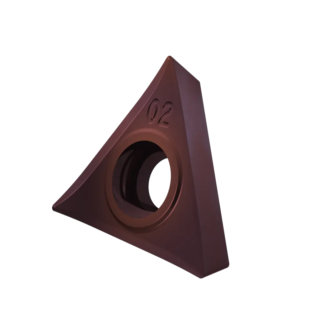 Односторонняя позитивная токарная пластина, треугольная с зазором 7°, диаметр вписанной окружности 6,35 мм, толщина 2,38 мм, радиус при вершине 0,2 мм, точность индексации в соответствии с классом допуска ISO-G, стружколом SF3 со скругленными режущими кромками, из сплава T8415.