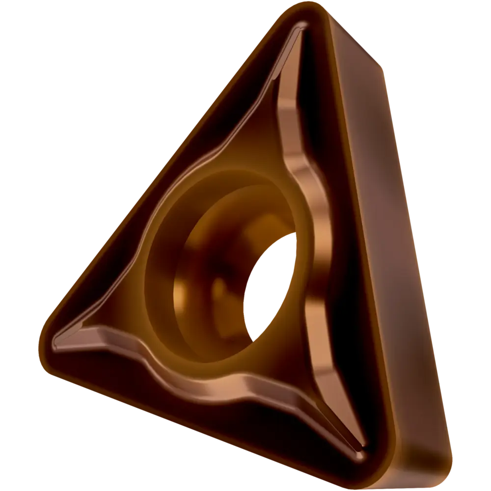 Односторонняя позитивная токарная пластина, треугольная с зазором 7°, диаметр вписанной окружности 3,97 мм, толщина 1,98 мм, радиус вершины 0,2 мм, точность индексации в соответствии с классом допуска ISO-M, стружколом FF2 со скругленными режущими кромками, из сплава T8430, мелкозернистого твердого сплава WC-Co с покрытием PVD в диапазоне ISO P20 -P40, для чистовой и средней обработки сталей.