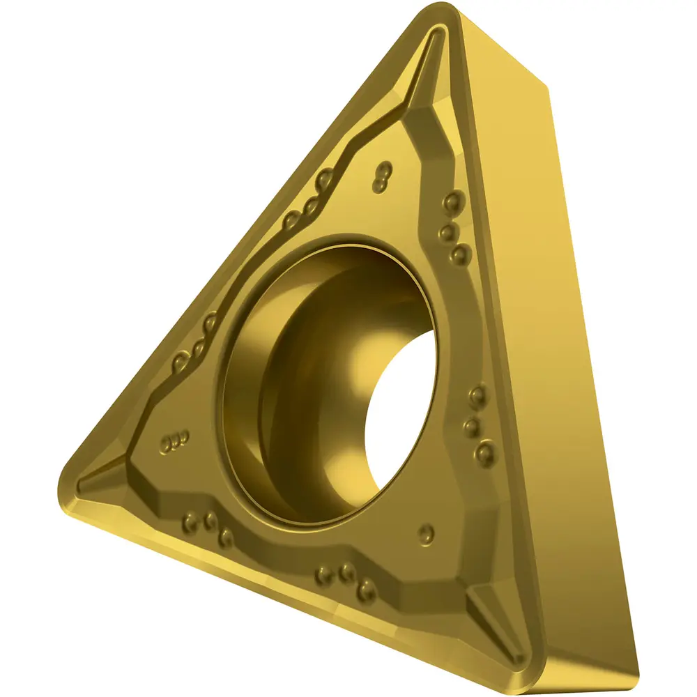 Односторонняя позитивная токарная пластина, треугольная с зазором 7°, диаметр вписанной окружности 6,35 мм, толщина 2,38 мм, радиус вершины 0,4 мм, точность индексации в соответствии с классом допуска ISO M, стружколом FM со скругленными режущими кромками, из сплава T8315, мелкозернистого твердого сплава WC-Co с покрытием PVD в диапазоне ISO M05 - M20, для чистовой и средней обработки нержавеющих сталей.