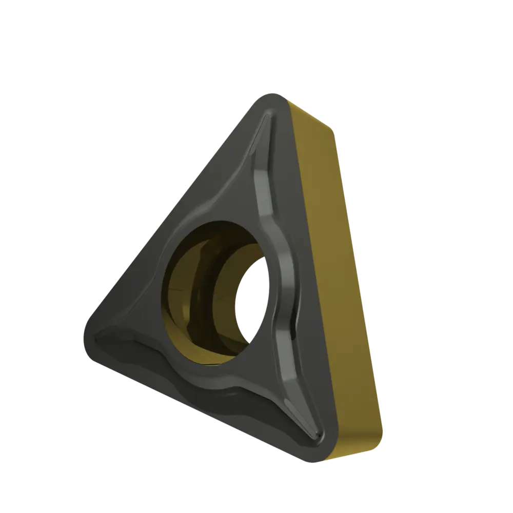Односторонняя позитивная токарная пластина, треугольная с зазором 7°, диаметр вписанной окружности 6,35 мм, толщина 2,38 мм, радиус вершины 0,8 мм, точность индексации в соответствии с классом допуска ISO-M, стружколом FF2 со скругленными режущими кромками, из сплава T9415, функционально-градуированного твердого сплава WC-Co с покрытием MT-CVD в диапазоне ISO P05 -P30, для чистовой и получистовой обработки сталей.