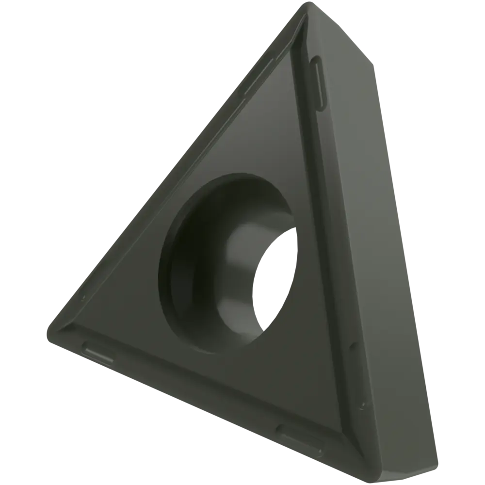 Односторонняя позитивная токарная пластина, треугольная с зазором 7°, диаметр вписанной окружности 9,525 мм, толщина 3,97 мм, радиус при вершине 0,4 мм, точность индексации в соответствии с классом допуска ISO-M, стружколом FF2 со скругленными режущими кромками, из сплава TT010, непокрытого кермета в диапазоне ISO P01 -P10, для чистовой и получистовой обработки сталей