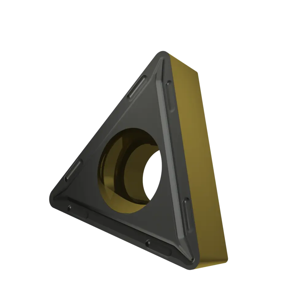 Односторонняя позитивная токарная пластина, треугольная с зазором 7°, диаметр вписанной окружности 9,525 мм, толщина 3,97 мм, радиус вершины 0,8 мм, точность индексации в соответствии с классом допуска ISO-M, стружколом FF2 со скругленными режущими кромками, из сплава T9415, функционально-градуированного твердого сплава WC-Co с покрытием MT-CVD в диапазоне ISO P05 -P30, для чистовой и получистовой обработки сталей.