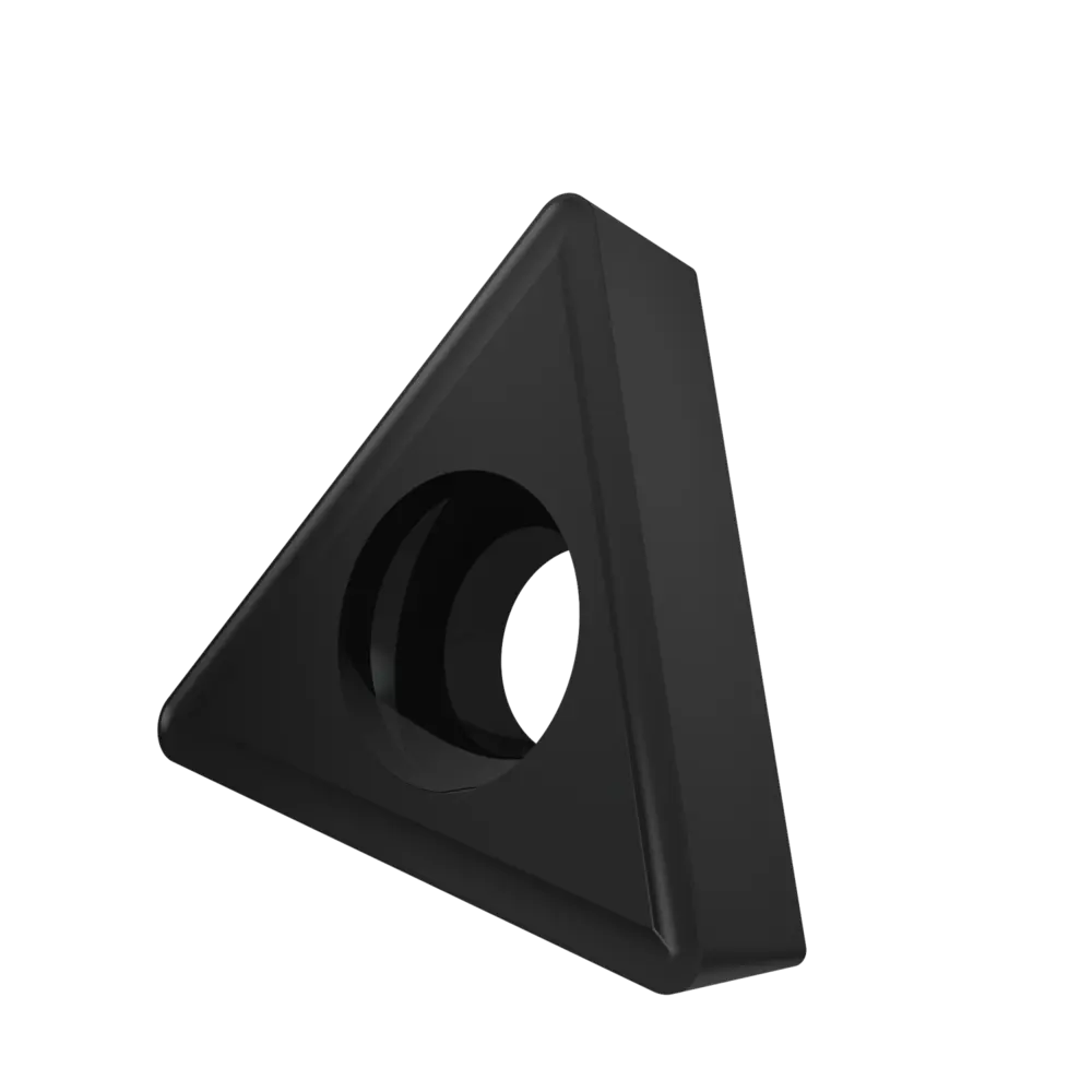 Односторонняя позитивная токарная пластина, треугольная с зазором 7°, диаметр вписанной окружности 9,525 мм, толщина 3,97 мм, радиус вершины 0,8 мм, точность индексации в соответствии с классом допуска ISO-M, стружколом RF со скругленными режущими кромками, из сплава T9325, функционально-градуированного твердого сплава WC-Co с покрытием MT-CVD в диапазоне ISO P15 -P35, для чистовой и тяжелой обработки сталей.