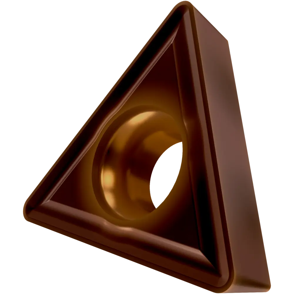 Односторонняя позитивная токарная пластина, треугольная с зазором 7°, диаметр вписанной окружности 9,525 мм, толщина 3,97 мм, радиус вершины 0,8 мм, точность индексации в соответствии с классом допуска ISO-M, стружколом RM3 со скругленными режущими кромками, из сплава T8430, мелкозернистого твердого сплава WC-Co с покрытием PVD в диапазоне ISO P20 -P40, для чистовой и тяжелой обработки сталей.