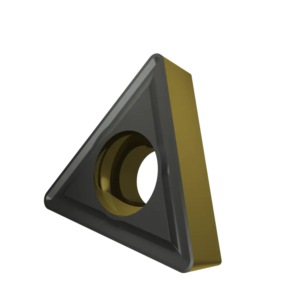 Односторонняя позитивная токарная пластина, треугольная с зазором 7°, диаметр вписанной окружности 9,525 мм, толщина 3,97 мм, радиус вершины 0,8 мм, точность индексации в соответствии с классом допуска ISO-M, стружколом RM3 со скругленными режущими кромками, из сплава T9415, функционально-градуированного твердого сплава WC-Co с покрытием MT-CVD в диапазоне ISO P05 -P30, для чистовой и тяжелой обработки сталей.