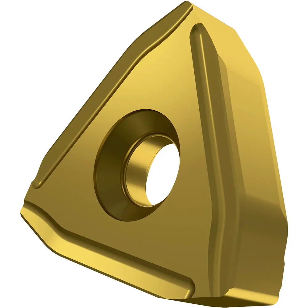 Двусторонняя негативная пластина для зачистки прутка, треугольная с диаметром вписанной окружности 21,96 мм, толщиной 7,94 мм для глубины резания 2 мм, точность индексации в соответствии с классом допуска ISO-G, стружколом PM с подготовкой режущей кромки S02, из сплава T9226, функционально-градуированного твердого сплава WC-Co с покрытием MT-CVD в диапазоне ISO P15 -P35, для сталей средней прочности.