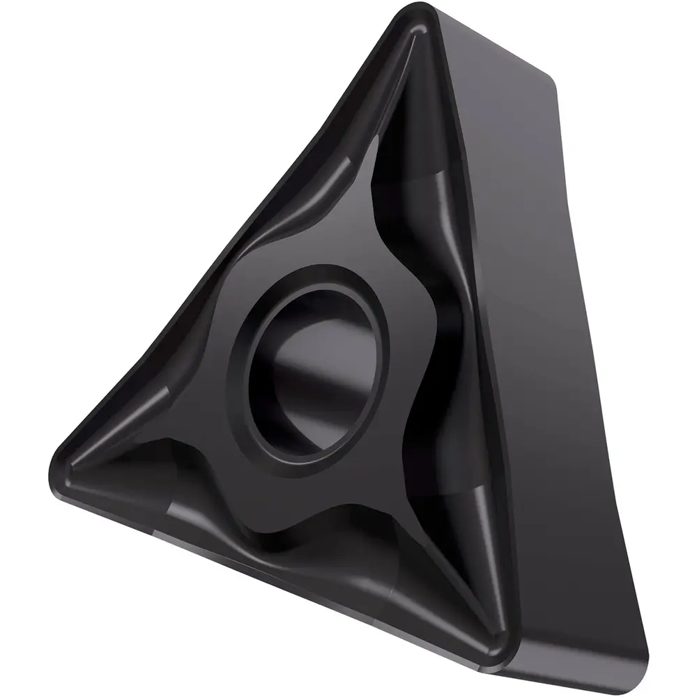 Двусторонняя негативная токарная пластина, треугольная с диаметром вписанной окружности 9,525 мм, толщиной 4,76 мм, радиусом при вершине 0,4 мм, точностью индексации в соответствии с классом допуска ISO M, стружколомом NF со скругленными режущими кромками, из сплава T6310, сверхмелкозернистого твердого сплава WC-Co с покрытием PVD в диапазонах ISO P01 -P15 и M01 -M15, для чистовой и средней обработки сталей и нержавеющих сталей.