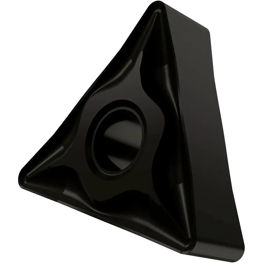 Двусторонняя негативная токарная пластина, треугольная с диаметром вписанной окружности 9,525 мм, толщиной 4,76 мм, радиусом при вершине 0,8 мм, точностью индексации в соответствии с классом допуска ISO M, стружколомом NF со скругленными режущими кромками, из сплава T7335, функционально-градуированного твердого сплава WC-Co с покрытием MT-CVD в диапазоне ISO M20 - M40, для чистовой и получистовой обработки нержавеющих сталей.