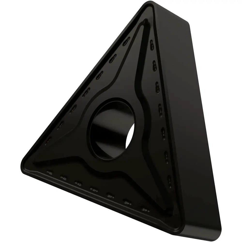 Двусторонняя негативная токарная пластина, треугольная с диаметром вписанной окружности 15,875 мм, толщиной 6,35 мм, радиусом при вершине 2,4 мм, точностью индексации в соответствии с классом допуска ISO M, стружколомом RM со скругленными режущими кромками, из сплава T9325, функционально-градуированного твердого сплава WC-Co с покрытием MT-CVD в диапазонах ISO P15 -P35 и M10 -M30, для средней и тяжелой обработки сталей и нержавеющих сталей.
