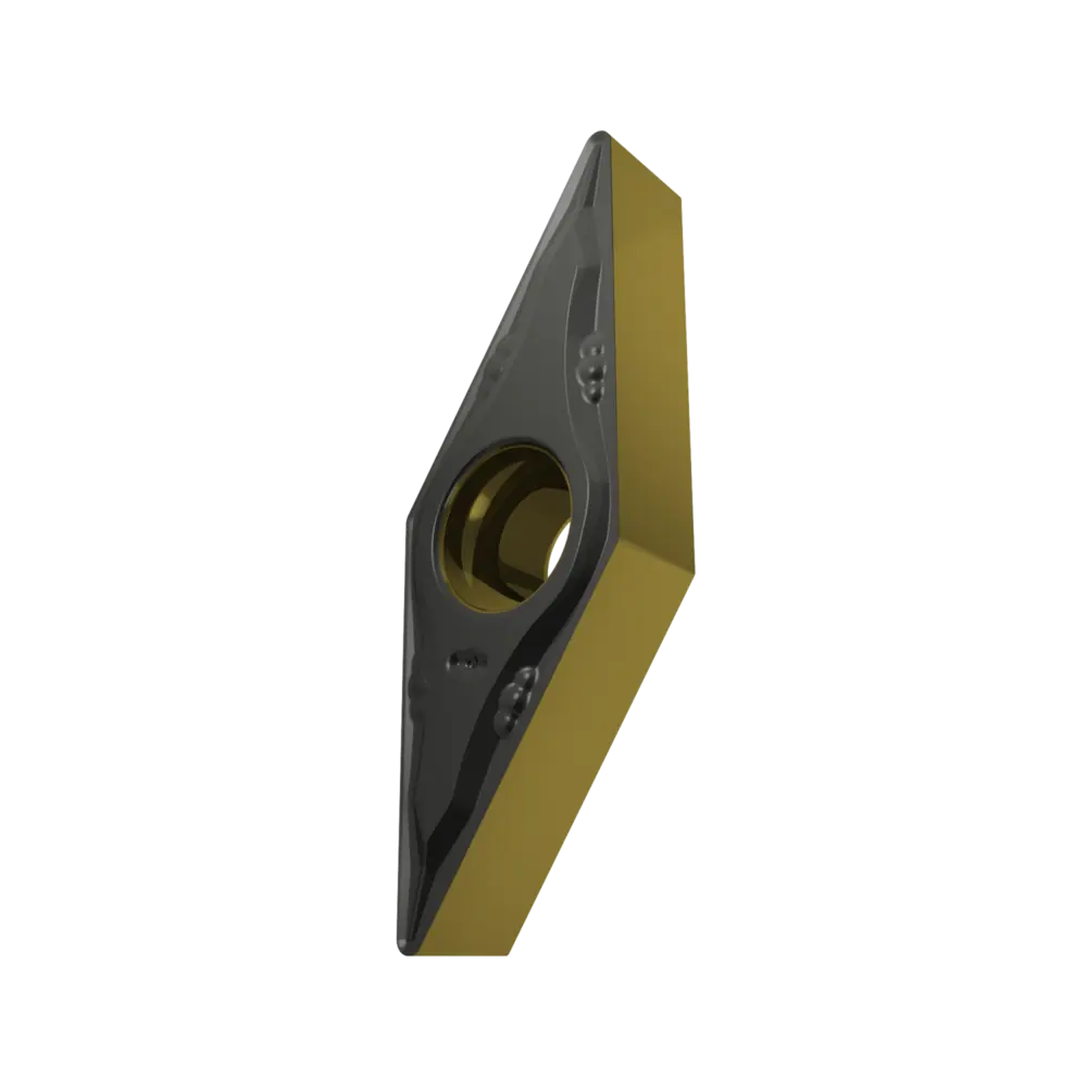 Односторонняя позитивная токарная пластина, ромб 35° с зазором 5°, диаметр вписанной окружности 6,35 мм, толщина 3,18 мм, радиус вершины 0,4 мм, точность индексации в соответствии с классом допуска ISO-M, стружколом FM со скругленными режущими кромками, из сплава T9415, функционально-градуированного твердого сплава WC-Co с покрытием MT-CVD в диапазоне ISO P05 -P30, для чистовой и получистовой обработки сталей.