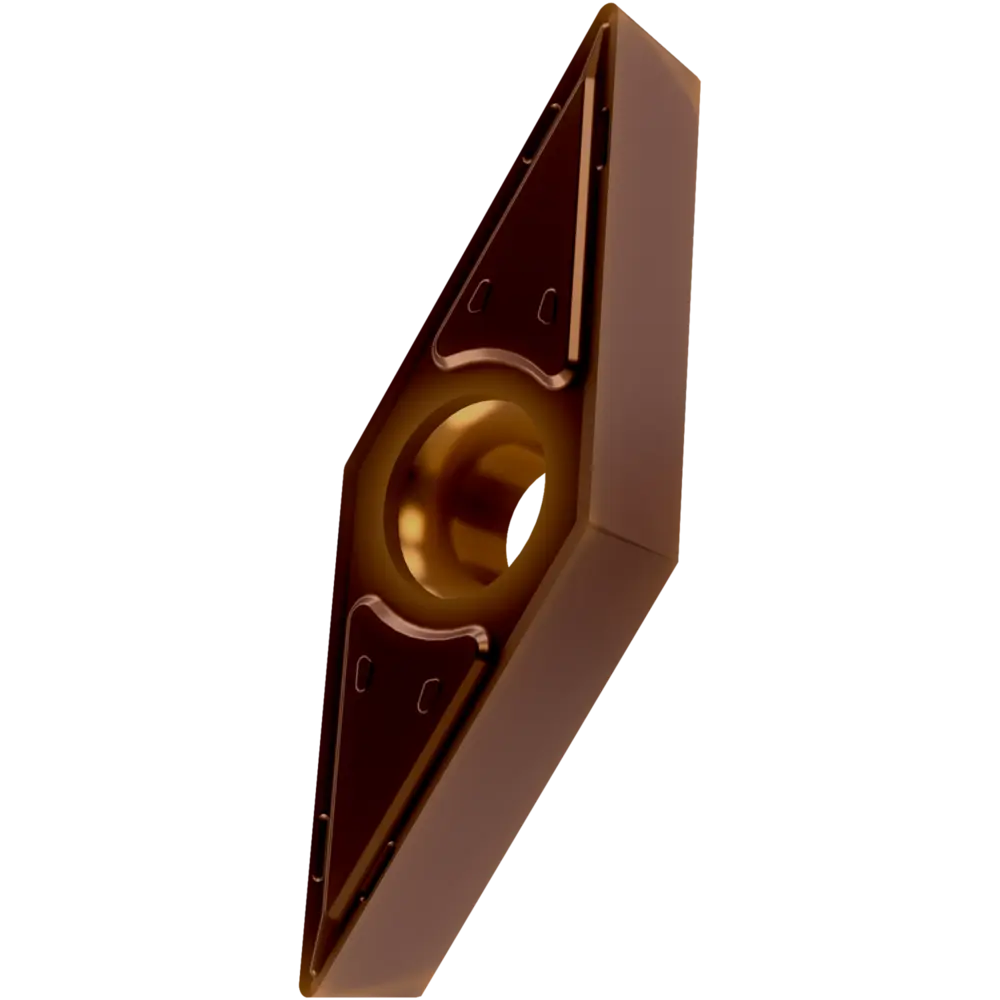 Односторонняя позитивная токарная пластина, ромбовидная 35° с зазором 5°, диаметр вписанной окружности 9,525 мм, толщина 4,76 мм, радиус вершины 0,4 мм, точность индексации в соответствии с классом допуска ISO-M, стружколом FF2 со скругленными режущими кромками, из сплава T8430, мелкозернистого твердого сплава WC-Co с покрытием PVD в диапазоне ISO P20 -P40, для чистовой и средней обработки сталей.