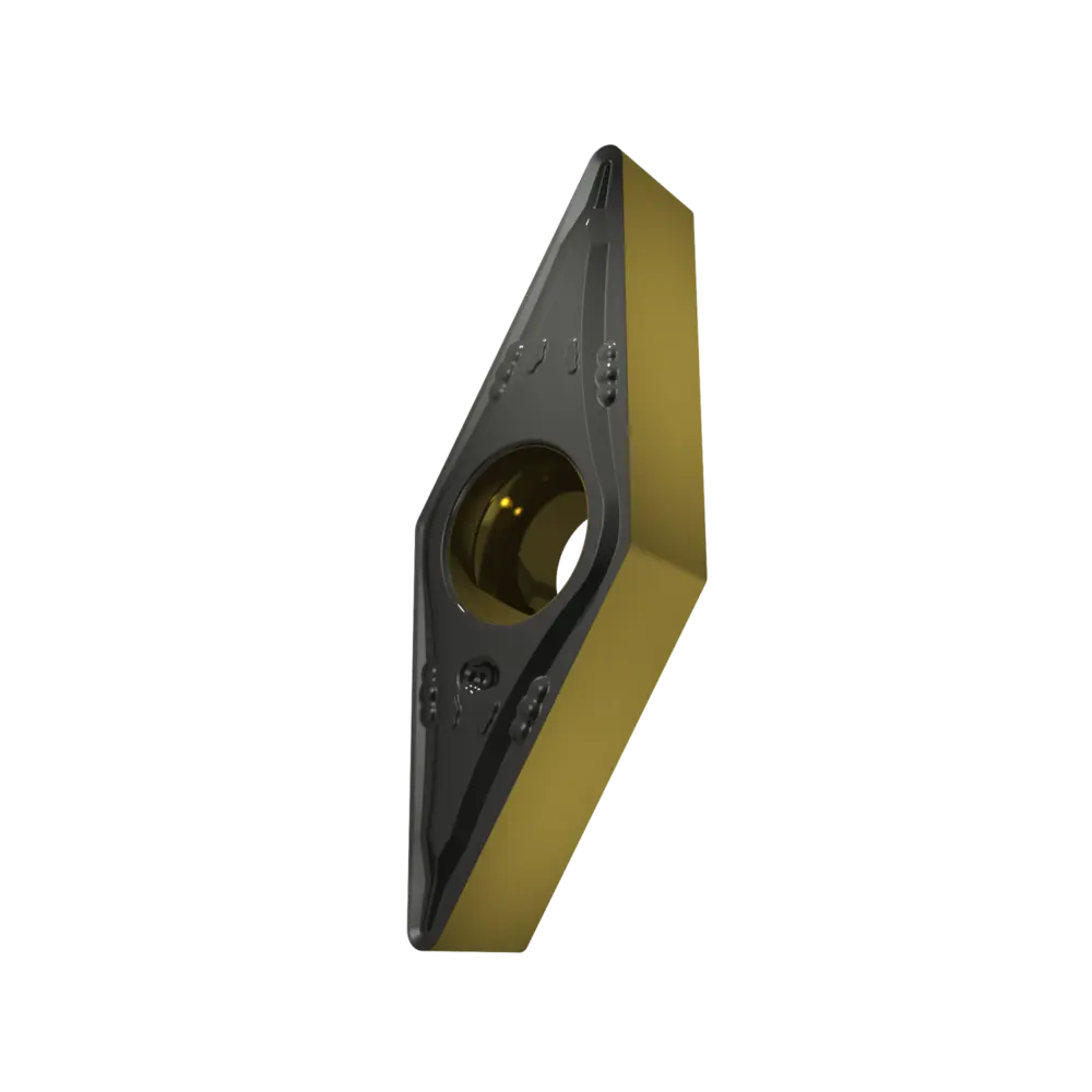 Односторонняя позитивная токарная пластина, ромбовидная 35° с зазором 5°, диаметр вписанной окружности 9,525 мм, толщина 4,76 мм, радиус вершины 0,8 мм, точность индексации в соответствии с классом допуска ISO-M, стружколом FM со скругленными режущими кромками, из сплава T9415, функционально-градуированного твердого сплава WC-Co с покрытием MT-CVD в диапазоне ISO P05 -P30, для чистовой и получистовой обработки сталей.