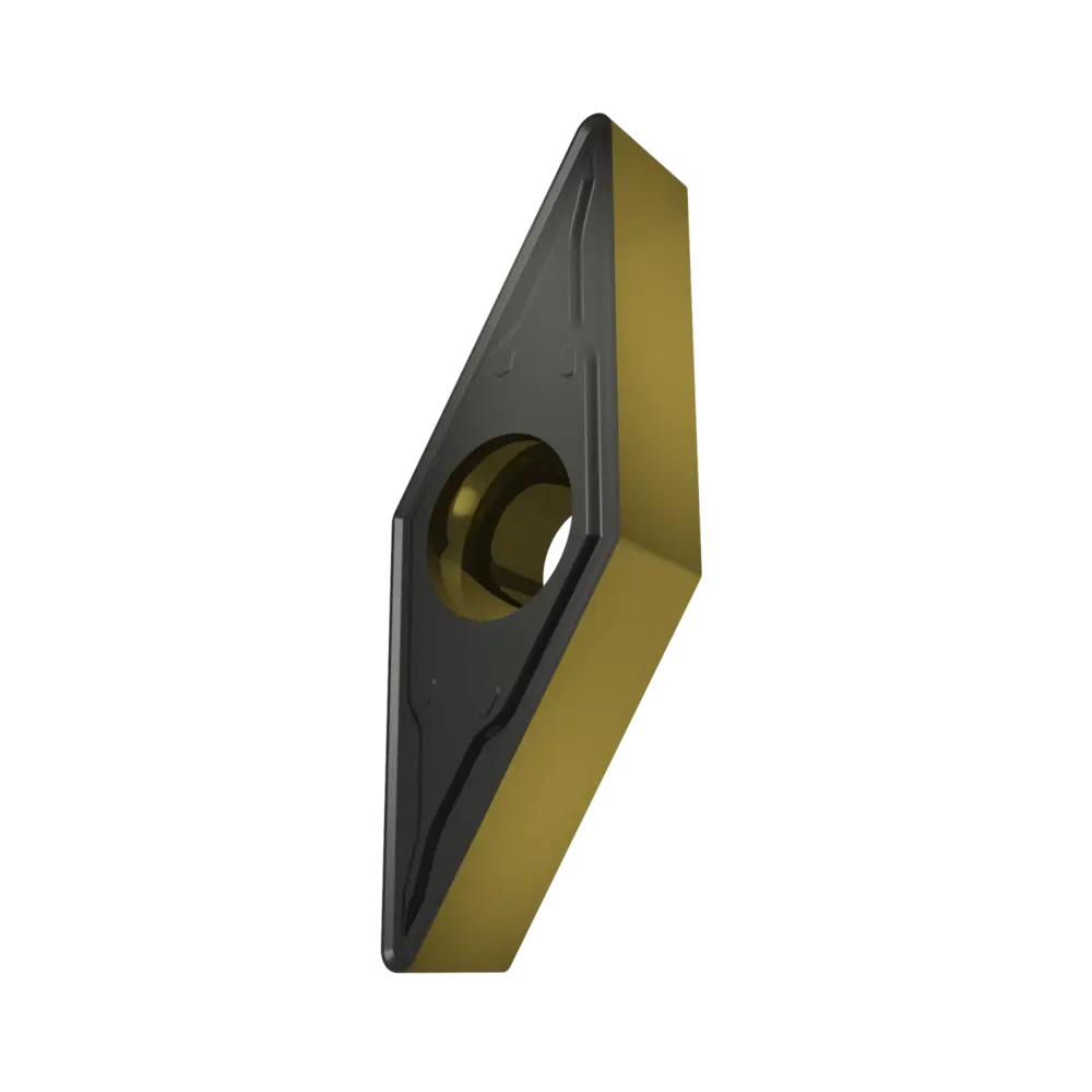 Односторонняя позитивная токарная пластина, ромбовидная 35° с зазором 5°, диаметр вписанной окружности 9,525 мм, толщина 4,76 мм, радиус вершины 0,8 мм, точность индексации в соответствии с классом допуска ISO-M, стружколом FM2 со скругленными режущими кромками, из сплава T9415, функционально-градуированного твердого сплава WC-Co с покрытием MT-CVD в диапазоне ISO P05 -P30, для чистовой и получистовой обработки сталей.