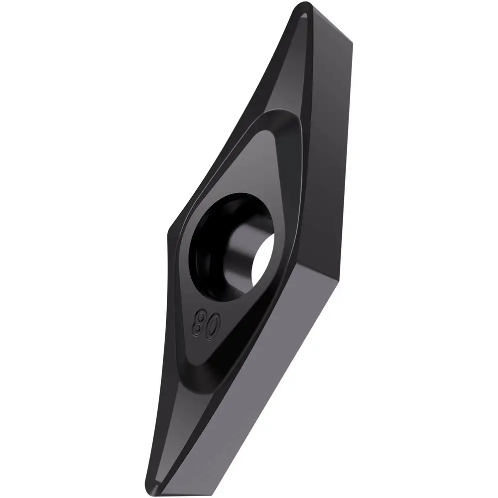 Односторонняя позитивная токарная пластина, ромбовидная 35° с зазором 7°, диаметр вписанной окружности 6,35 мм, толщина 3,18 мм, радиус вершины 0,4 мм, точность индексации в соответствии с классом допуска ISO-G, стружколом SF3 со скругленными режущими кромками, из сплава T6310, сверхмелкозернистого твердого сплава WC-Co с покрытием PVD в диапазонах ISO M01 - M15/N05 - N20 и S01 - S15, для чистовой и средней обработки нержавеющих сталей, цветных металлов и суперсплавов.