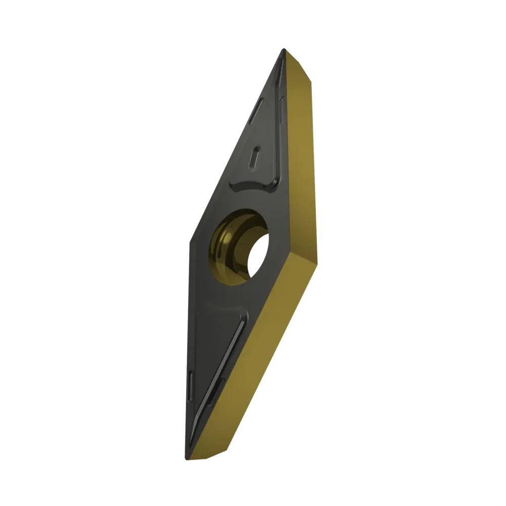 Односторонняя позитивная токарная пластина, ромбовидная 35° с зазором 7°, диаметр вписанной окружности 7,94 мм, толщина 3,18 мм, радиус вершины 0,2 мм, точность индексации в соответствии с классом допуска ISO-G, стружколом FF2 со скругленными режущими кромками, из сплава T9415, функционально-градуированного твердого сплава WC-Co с покрытием MT-CVD в диапазоне ISO P05 -P30, для чистовой и получистовой обработки сталей.