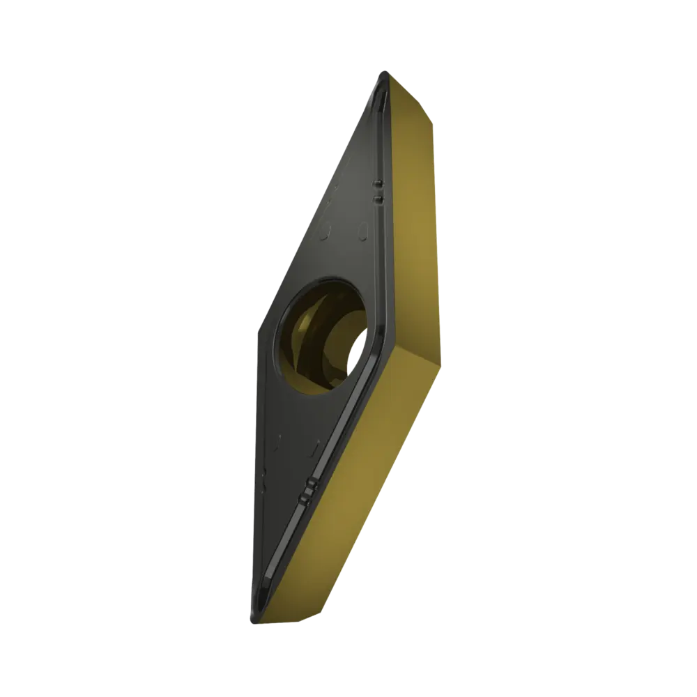 Односторонняя позитивная токарная пластина, ромбовидная 35° с зазором 7°, диаметр вписанной окружности 9,525 мм, толщина 4,76 мм, радиус вершины 0,4 мм, точность индексации в соответствии с классом допуска ISO-M, стружколом UR со скругленными режущими кромками, из сплава T9415, функционально-градуированного твердого сплава WC-Co с покрытием MT-CVD в диапазоне ISO P05 -P30, для чистовой и тяжелой обработки сталей.