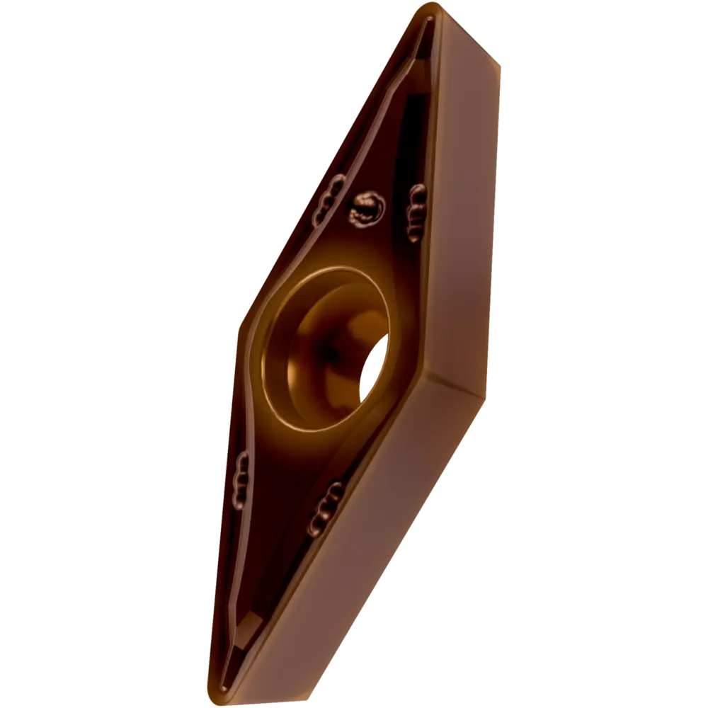 Односторонняя позитивная токарная пластина, ромбовидная 35° с зазором 7°, диаметр вписанной окружности 9,525 мм, толщина 4,76 мм, радиус вершины 0,8 мм, точность индексации в соответствии с классом допуска ISO-M, стружколом FM со скругленными режущими кромками, из сплава T8430, мелкозернистого твердого сплава WC-Co с покрытием PVD в диапазонах ISO P20 -P40 и M20 -M35, для чистовой и средней обработки сталей и нержавеющих сталей.